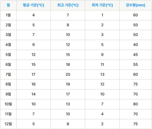 반면, 겨울철(11월~2월)에는 여행하기 좋지 않은 시기로 분류됩니다. 이 시기에는 날씨가 춥고, 비가 자주 내리며, 바람도 강하게 불어 외부 활동이 힘들어질 수 있습니다. 특히 1월과 2월은 가장 추운 시기로, 기온이 종종 0도 이하로 떨어지기도 하여 여행에 불편함을 줄 수 있습니다.