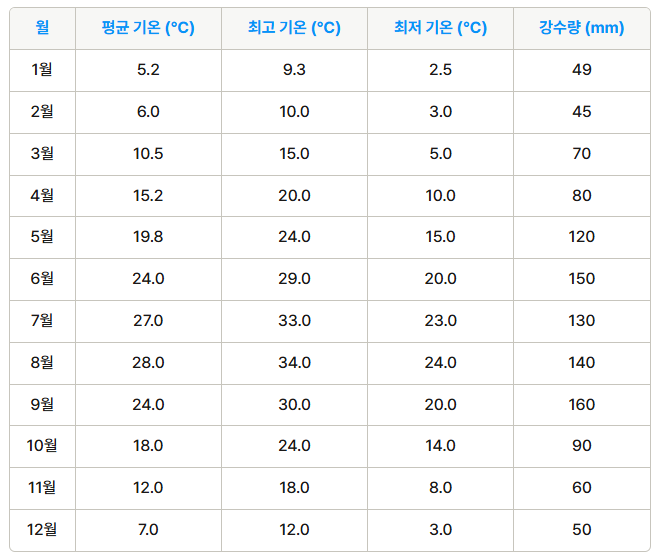 겨울 : 12월부터 2월까지는 기온이 낮아져 춥고, 특히 1월은 최저 기온이 0도 이하로 떨어지는 날도 많습니다. 이 시기에는 외부 활동이 제한적이며, 관광 명소도 겨울철에는 운영 시간이 단축되거나 휴무인 경우가 많아 여행에 불편함을 초래할 수 있습니다.