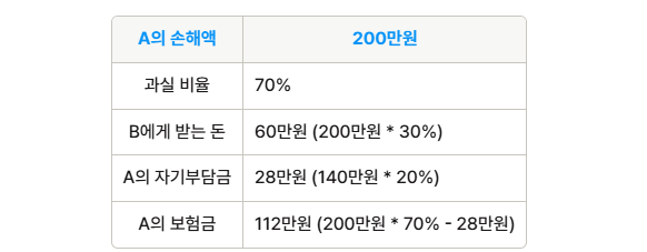 A와 B 간의 교통사고에서 A의 과실이 70%, B의 과실이 30%로 나왔다고 가정해 보겠습니다. A의 차량 수리비가 200만원이라면, B는 A에게 60만원을 보상하고, 나머지 140만원은 A가 자차보험으로 처리합니다. A는 자기부담금으로 28만원을 지불하고, 최종적으로 112만원을 보상받게 됩니다.