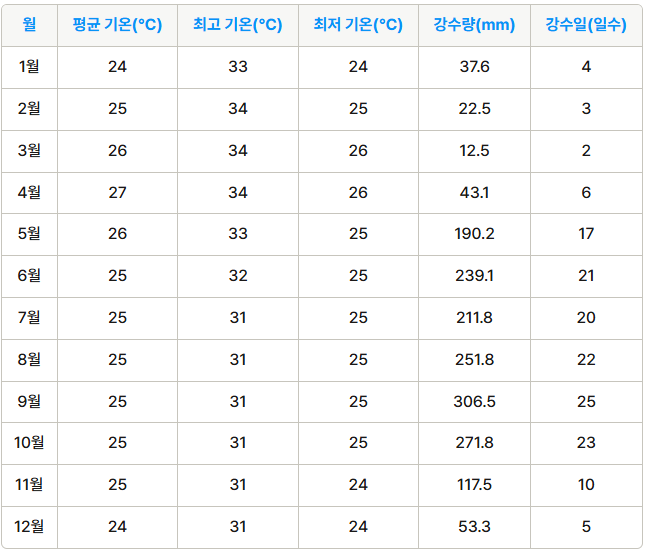 반면, 5월부터 10월까지는 우기가 시작됩니다. 이 시기에는 높은 습도와 강수량으로 인해 여행하기에는 다소 불편할 수 있습니다. 특히, 8월과 9월은 강수량이 가장 많아져 일정이 취소되거나 변경되는 경우가 많습니다. 비가 많이 오는 날엔 야외 활동을 계획하기 어려운 점도 고려해야 합니다.